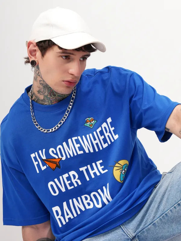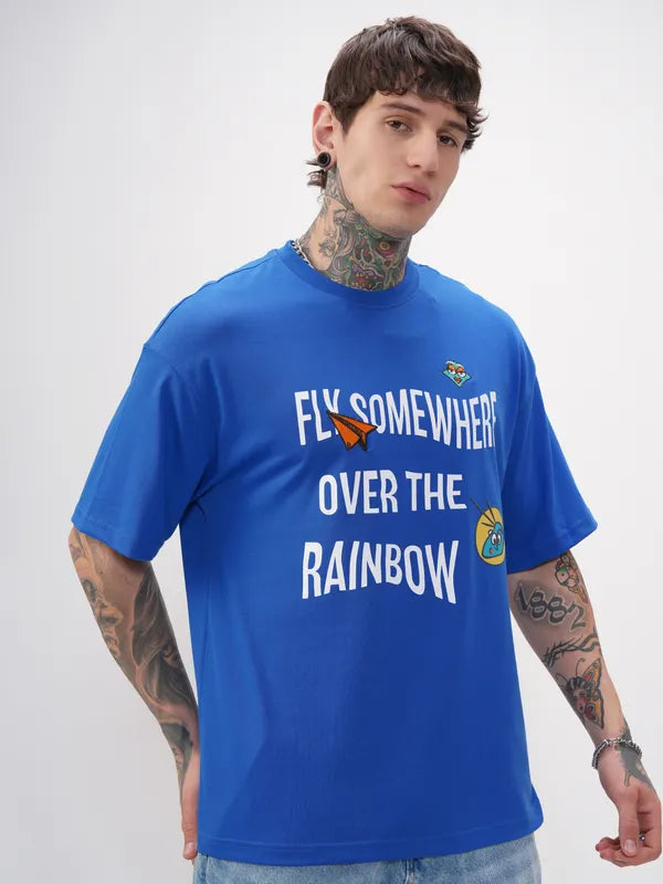 Men Blue Printed Round Neck Oversized Fit T-Shirt