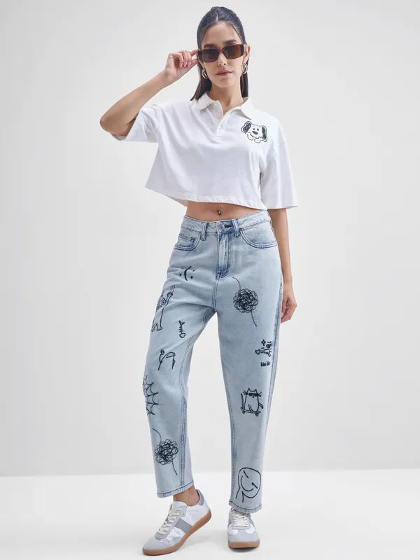 Designed with practical details, the jeans feature classic five-pocket styling, a secure zip and button closure, and functional belt loops, combining style with utility. The mid-rise waist adds a flattering touch, offering support while accentuating the natural curves, and allows for versatile styling options such as tucking in tops or pairing with cropped blouses.
